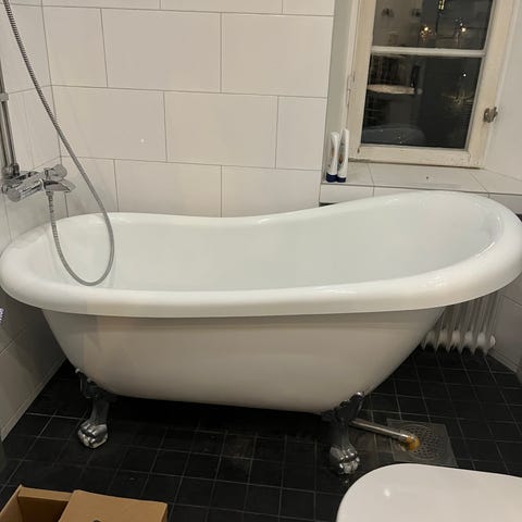 Fristående vitt badkar med kromfärgade lejontassar