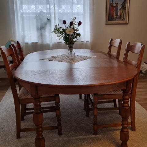 Ivar Ericson matgrupp matbord med iläggsskiva och 4 stolar trä brun1 500 krUlricehamnLägg till i favoriter.