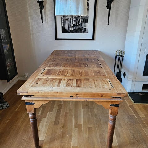 Matgrupp träbord stolar och vitrinskåp i furu