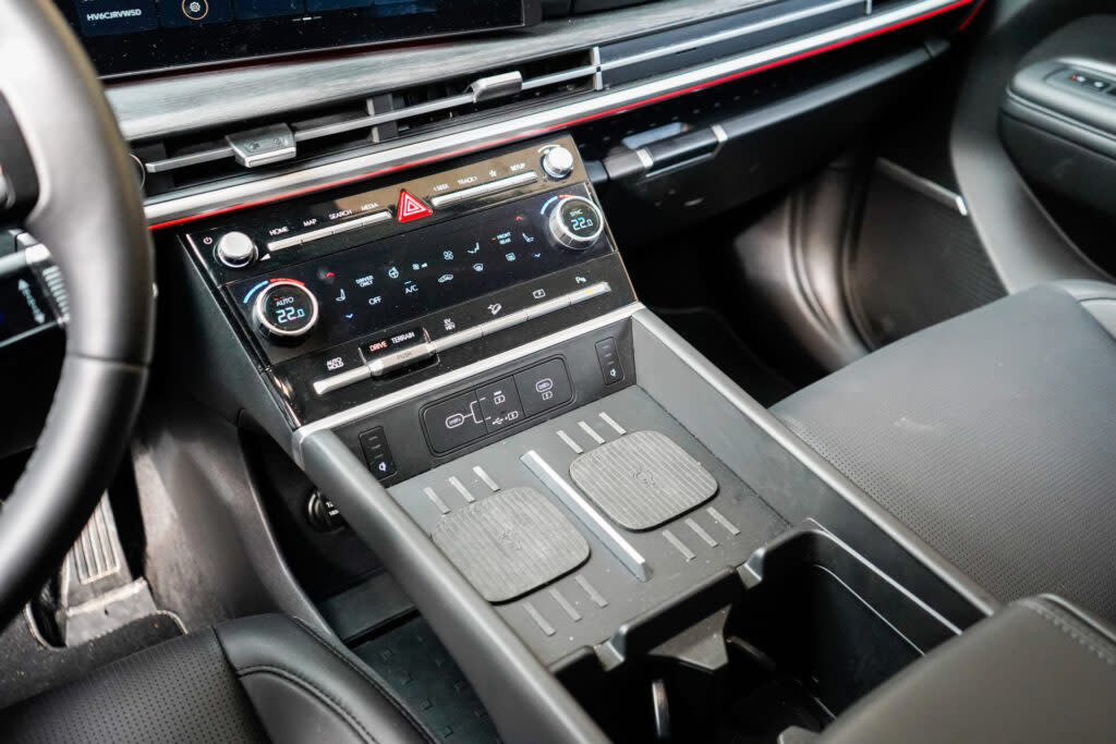 Det är sällan barnen på andra och tredje raden som betalar kalaset. Därför är det väl rimligt att de vuxna i framsätena får något extra? Det får de verkligen i Santa Fe! Jag får återigen känslan av att Hyundai sneglat över axeln på ett märke som börjar med "L" och slutar med "and Rover". Det är kombinationen av en överskådlig layout, genomtänkta förvaringslösningar, rymlighet och fina material som får Santa Fe att stå ut. Föraren har två 12,3-tums skärmar framför sig i hög upplösning, med snabba processorer. Hyundais egna system är inte ledande i klassen vad gäller användarvänlighet, men man vänjer sig snabbt. Det underlättas av att det finns fysiska knappar och en separat klimatpanel. Passageraren har inte bara ett, utan två handskfack framför sig. Mittkonsolen rymmer två smartphones för laddning – trådlöst eller med kabel. Under mittkonsolen finns ett stort förvaringsfack, likaså i armstödet. Den mängd prylar som en stor familj producerar göms alltså effektivt undan. Kvaliteten kanske inte är helt i nivå med de brittiska aristokraterna som inspirerat Hyundai, men det är närmare än man tror. Testbilen har lädersäten med värme och ventilation samt innertak i mocka. Känslan av kvalitet är hög – precis som sittpositionen.