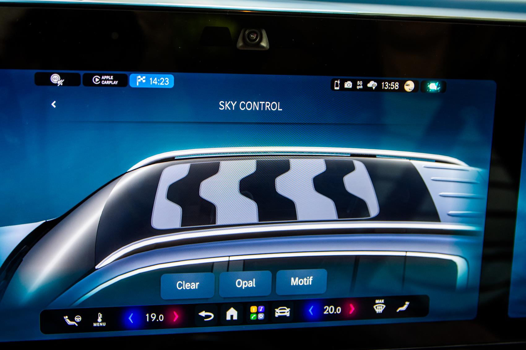 Genom att trycka på rätt knapp frågar rösten i högtalarna vad den kan hjälpa till med, och i enlighet med min begäran ändras mönstret i taket. Det varierar från helt genomskinligt, via en slags blandning av huggorms- och zebraränder, till djupfryst februarimorgon. Om du dessutom har kryssat för Sky Control-paketet kommer 158 lysande Mercedes-stjärnor låta dig segla genom natten i din egen personliga galax.