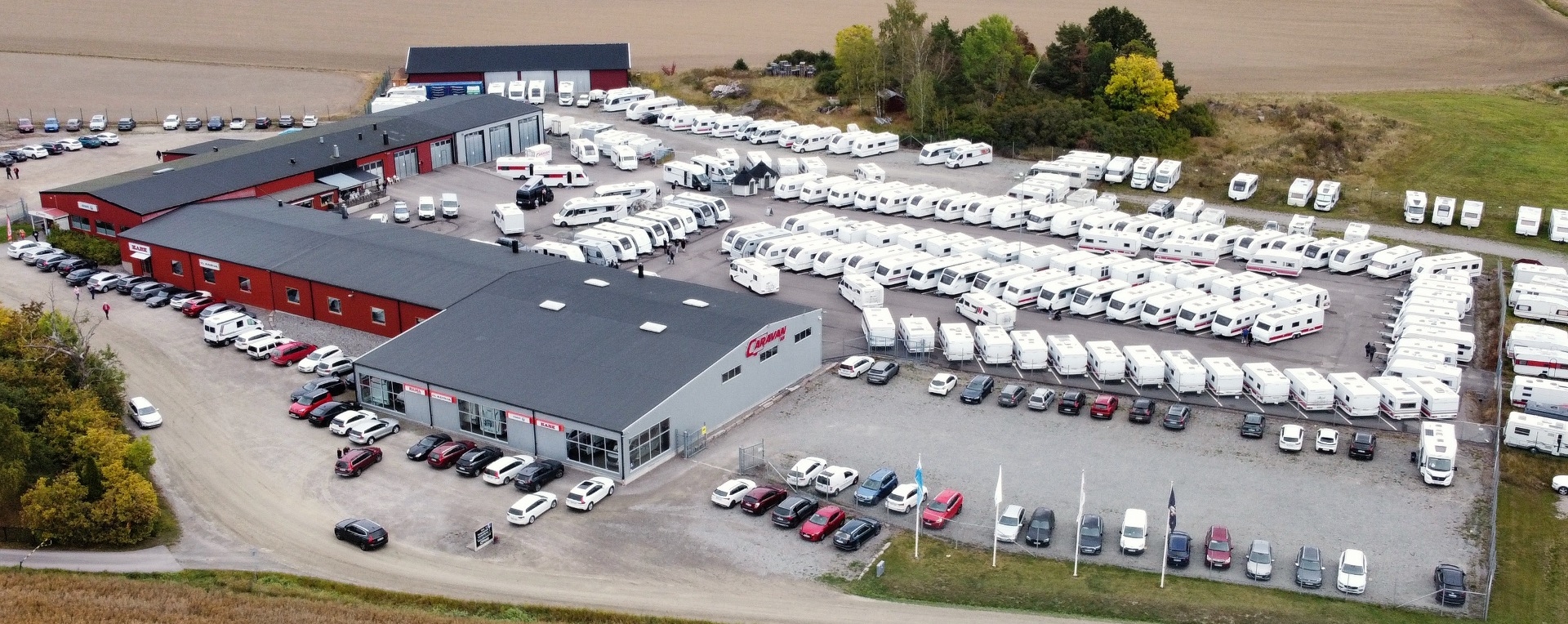 Hos oss finns (inomhus och utomhus) oftast ett 150-tal nya och begagnade husvagnar och husbilar i lager, med ett brett utbud av olika märken till bra priser.