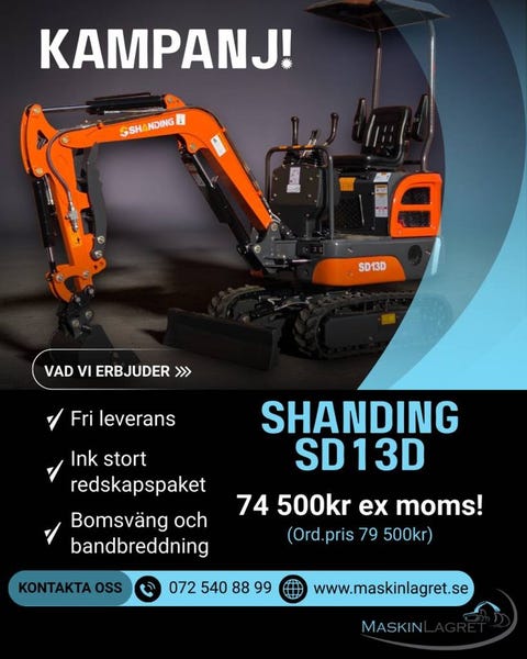 Minigrävare Shanding SD13D med joysticks. KAMPANJPRIS!2026105 625 krKarlstad ∙ Maskinlagret i VärmlandFöretag1 dagLägg till i favoriter.