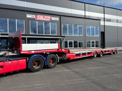 30 min12m Maskinsläp 38t 4-axlat, p-light hydr. ramper , Omg. Lev.