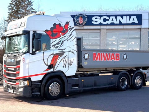 1 dagLastväxlare Scania R490 8X4 med Sprider M-25 och CMT 13 cbm flak
