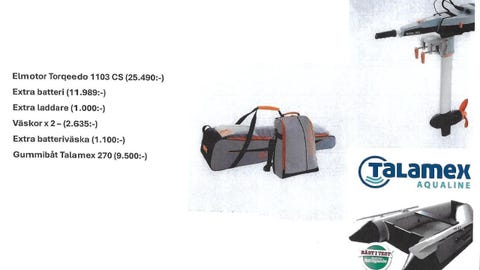 Gummibåt Talamex 270 / Elmotor Torqeedo 1103 CS36 500 krStockholm ∙ Karlbergskanalens Marina ABFöretag15.09.25Lägg till i favoriter.