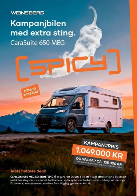 Weinsberg CaraSuite 650 MEG Edition Spicy KAMPANJPRIS!!20261 049 000 krRättvik ∙ Dala Fritidscenter ABFöretag3 dagarLägg till i favoriter.