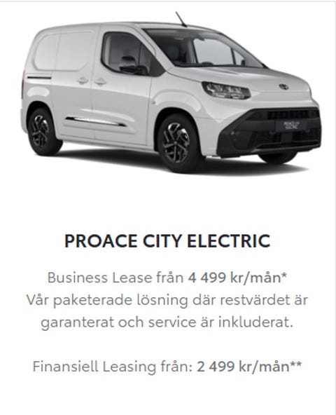 Är du redo att köra grönt och smart i en Toyota Proace City elbil? Du kan hitta precis det du letar efter på Blocket! Vårt urval av Toyota Proace City elbilar ger dig allt det bästa från framtidens teknik – noll utsläpp och maximal körglädje. Med 49 Toyota Proace City elbilar till salu på Blocket finns det ingen anledning att vänta! Oavsett om du vill susa runt i stan i en kompakt modell eller ta långa, bekväma körningar hittar du den perfekta Toyota Proace City elbilen för dig. Hoppa in i framtiden idag – din nästa Toyota Proace City elbil väntar på dig!