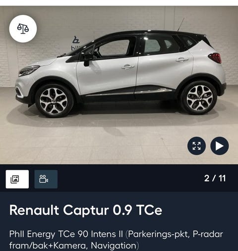 Renault Captur0.9 TCe Manuell2019 ∙ 8 600 mil ∙ Bensin ∙ Manuell99 000 krTygelsjöPrivat ∙ Service7 dagarAdd to favourites.