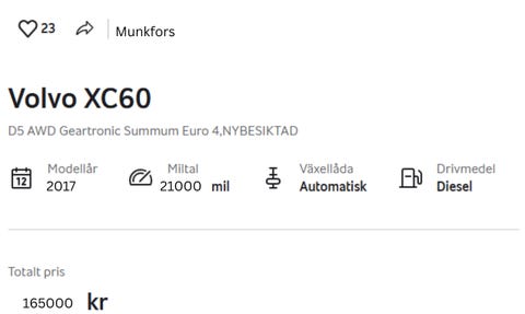10 timÄr du redo att köra iväg i en Volvo XC60? Det finns just nu 68 Volvo XC60 bilar till salu på Blocket. Den här biltypen är ett populärt val för dig som vill kombinera körglädje, komfort och smart funktionalitet. Oavsett om du prioriterar vardagskörning, sportigare känsla eller extra bekvämlighet finns det utföranden som passar olika behov och preferenser.