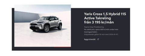 18 timÄr du redo att köra iväg i en Toyota Yaris Cross? Det finns just nu 28 Toyota Yaris Cross bilar till salu på Blocket. Den här biltypen är ett populärt val för dig som vill kombinera körglädje, komfort och smart funktionalitet. Oavsett om du prioriterar vardagskörning, sportigare känsla eller extra bekvämlighet finns det utföranden som passar olika behov och preferenser.