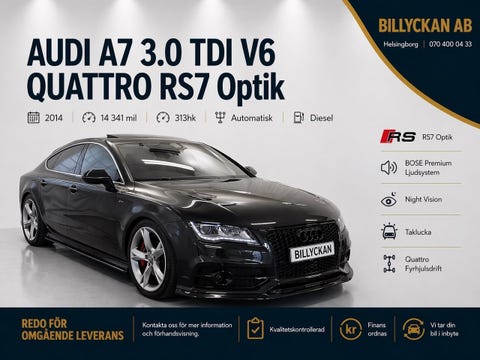 Audi A7Sportback 3.0 TDI V6 quattro S Tronic S Line RS7 FRONT2014 ∙ 21 100 mil ∙ Diesel ∙ Automatisk189 900 krKarlstad ∙ BilOn Nordic ABFöretag13 aprLägg till i favoriter.Öppna annons