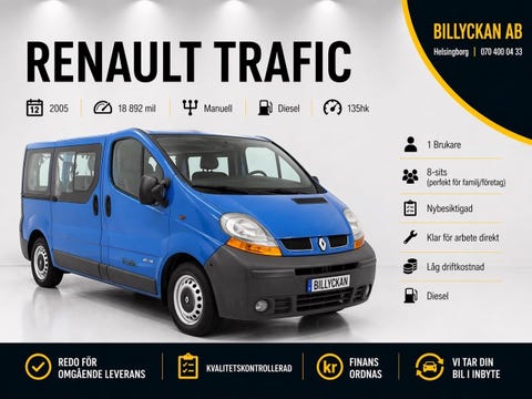 Renault Trafic2.9t 2.5 dCi / 1-Brukare / Nybesiktad / 8-sits / 135hk2005 ∙ 18 892 mil ∙ Diesel ∙ Manuell69 900 krPåarp ∙ Billyckan ABFöretag1 dagLägg till i favoriter.