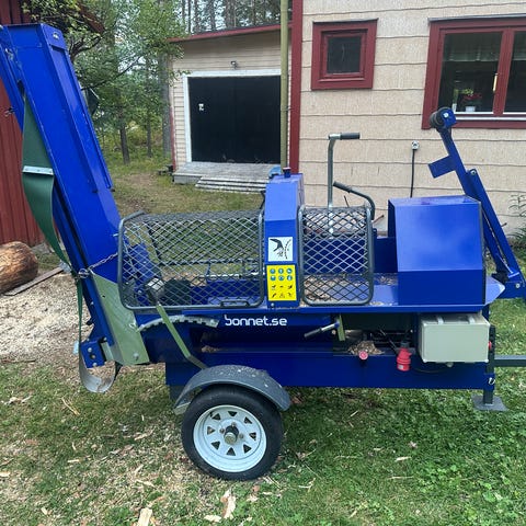 Hög tid att kapa och klyva veden. Vi hyr ut vedmaskin som gör jobbet betydligt enklare. Denna klipper och klyver i ett och samma moment och har ett tillhörande transportband. Vill man så hyr man till en släpvagn som på bilden.