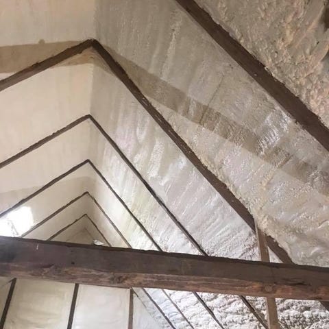 Betongbjälklag kan man spraya direkt emot och eftersom produkten sprayas på skarvfritt så får man en sömslös yta som är diffusionstät, radontät och helt lufttät runt alla genomföringar. Utöver detta isolerar den extremt bra och kundreferenser har fått 3-5 grader varmare på golven direkt efter installation.
