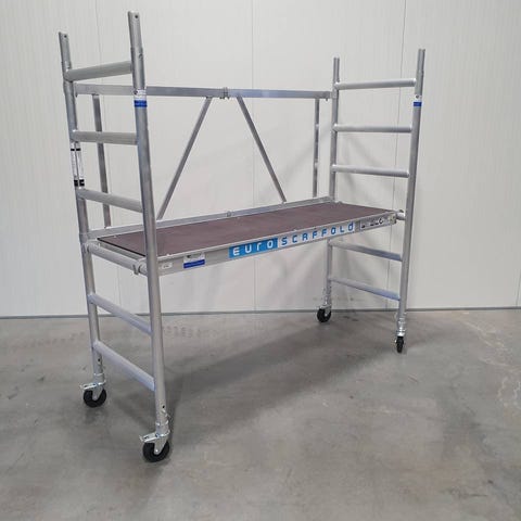 Montering utan verktyg tack vare ihopvikbar grundsektion. Monteras på under 1 minut. Plattform med lucka och aluminiumram, kraftfulla hjul med broms.