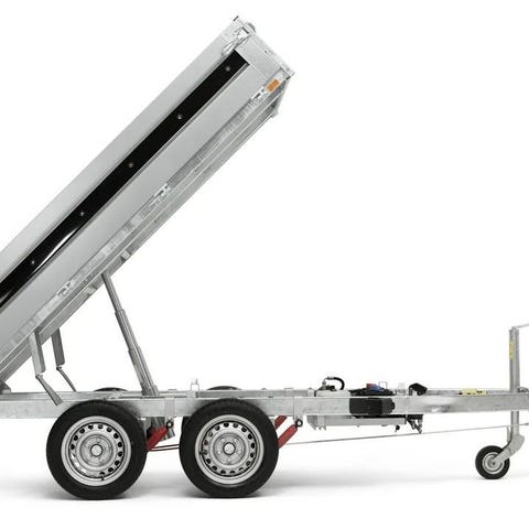 Professionell tippbar släpvagn för anläggnings- eller byggarbete, med låg tyngdpunkt för högre säkerhet och stabila köregenskaper. D-serien är ett pålitligt val vid transport av småmaskiner och smidig vid lastning och lossning.
