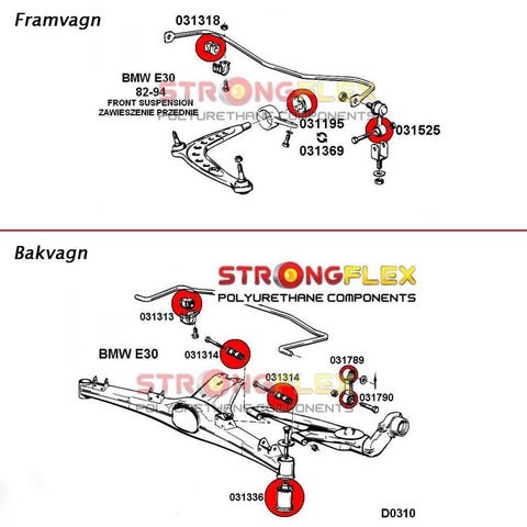 Röd polyuretanbussning = Motsvarar original hårdhet (80 ShA).