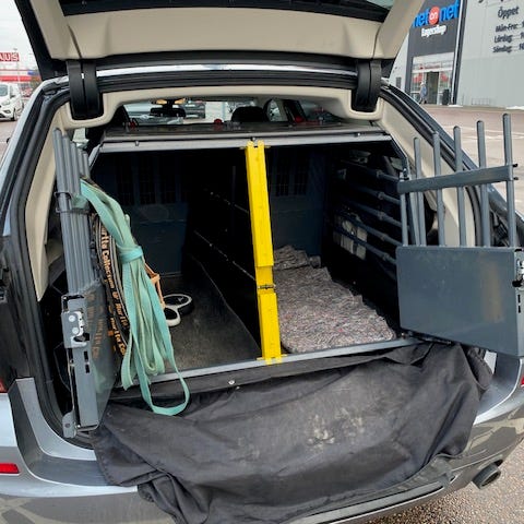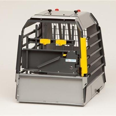 Enkelbur som är i storlek mellan Large och Extra Large. Passar tex som högsta bur i Skoda Karoq och Volkswagen Passat årsmodell 2015 och nyare, En säker och mycket praktisk hundbur, som också lämnar plats för annat bagage. Med några enkla handgrepp anpassas djupet till just din bil. Välj en enkelbur om ni inte har mer än en hund och vill ha den andra sidan av bagageutrymmet till annat.