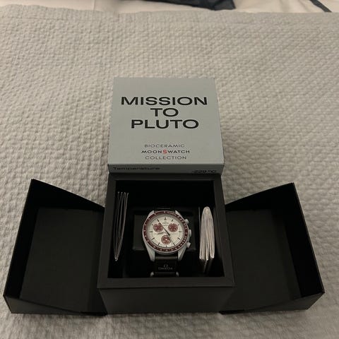Säljer en Omega x Swatch MoonSwatch från Bioceramic MoonSwatch Collection, Mission on Earth. Klockan har en grön boett, svart urtavla med vita detaljer och kronograffunktion. Kommer i originalförpackning med kvitto. Perfekt för dig som gillar unika accessoarer.