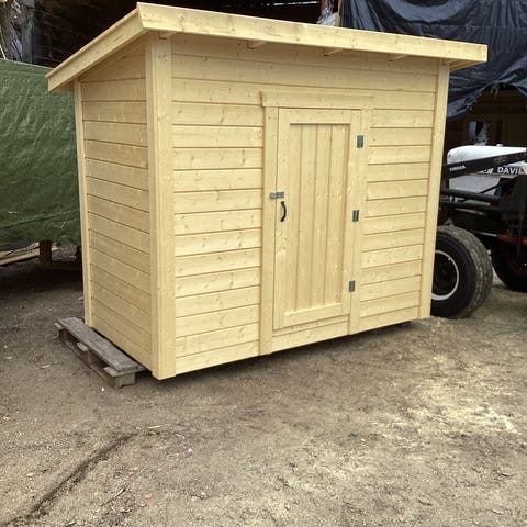 Perfekt förråd till skidor, redskap, ved mm. Monteras på vägg. kommer i tre färdiga sidor med en dörr och golv med råspont 22x120mm.