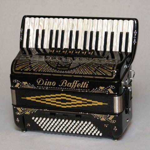 Helt nyinkommet Dino Baffetti "Studio II Bis" i en tuff specialversion i svart utförande med röda tangenter och basknappar samt med röd pärldekoration!