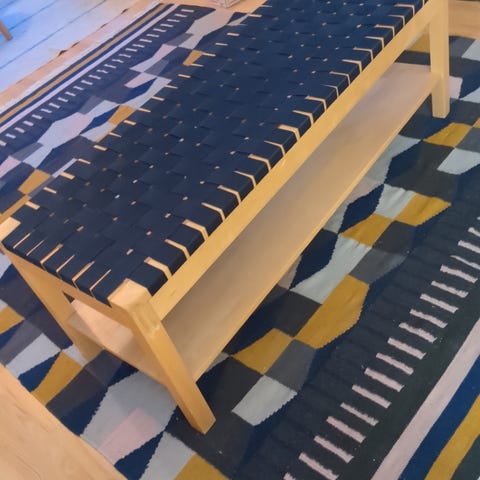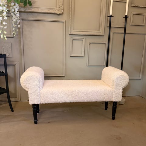 Stilren bänk med grått eller mörkt fårskinn. Stomme i bok.