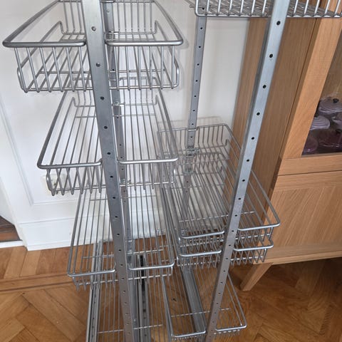 Säljer en utdragshylla från Ballingslöv som endast används några månader då vår husleverantör levererade fel produkt. Det är två hyllplan med tillhörande stativ för montering i skåp / hörnskåp. Mått på hyllplan syns på bild.