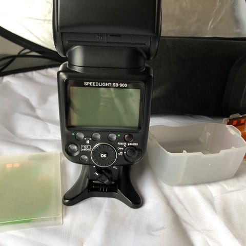 mycket bra skick Ingår: vit softbox-lock (har en spricka, fortfarande funktionsduglig), gröna och gula filter, fotstativ för trådlös blixt, fodral. Blixten fungerar perfekt med TTL