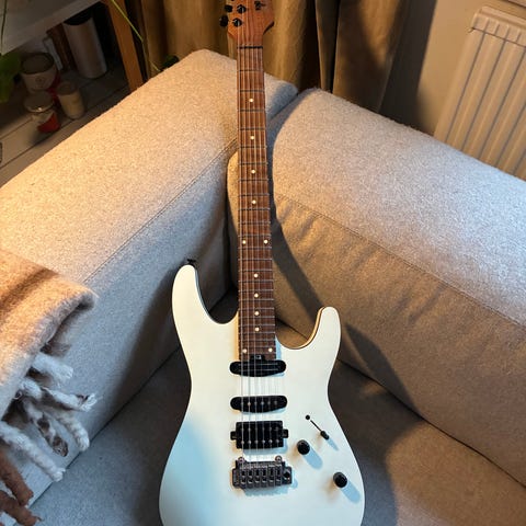 Harley benton Fusion med DiMarzio John Petrucci Illuminator mickar. Knappt spelad på, låter fantastiskt och har en otroligt vacker hals i rostad lönn. Även brädan är rostad lönn. Switch för att splittra mickarna. Finns ett litet glapp i mickväljaren som kommer och går, lätt fixat om man orkar öppna gitarren. I mycket bra skick i övrigt!