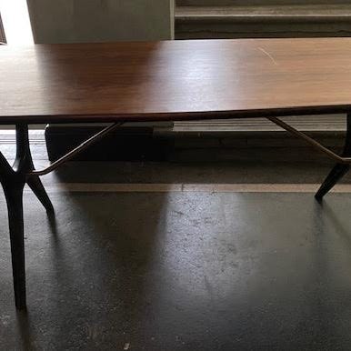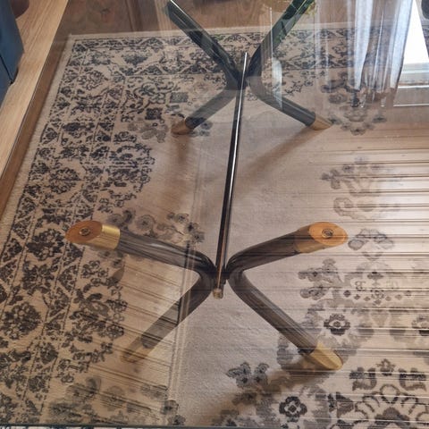Soffbord med skiva i glas och underrede i mässingsfärgad metall. Bordet har korslagda ben och en rundad form på skivan. Passar som soffbord eller sidobord i vardagsrum eller liknande utrymme.