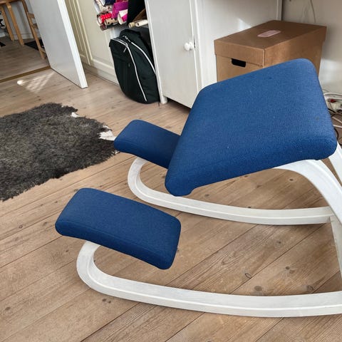 Nyckelord: ergonomisk stol, balansstol, Stokke-inspirerad, kontor, hemma, trä, blå