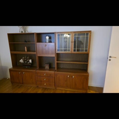 Jättefint vitrinskåp/hyllor som inte längre används. Har några små skador, en underdel som saknar baksida men annars är den jättefin.
