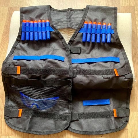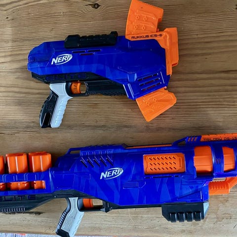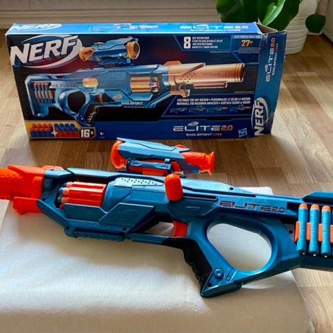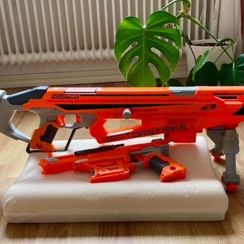 Nerf är en serie leksaksvapen tillverkade av Hasbro. De är kända för att vara säkra och användas för lekfulla strider och spel. Nerf-vapen skjuter vanligtvis mjuka skumprojektiler, vilket gör dem populära för både barn och vuxna. Nu säljer min son hela sin samling. Allt är sparsamt använt och vi hoppas att de kan komma till glädje för någon annan istället för att stå som prydnad här hemma.