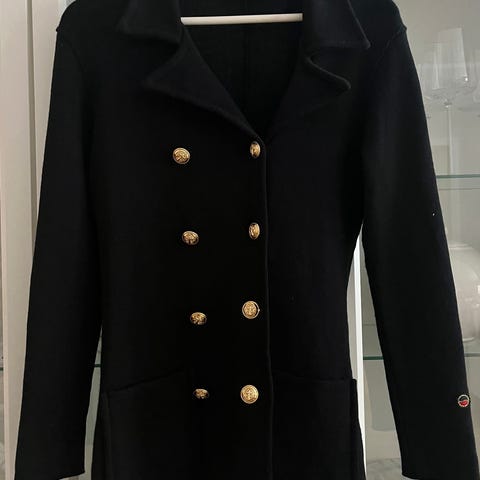 En marinblå väst i 100% ull som är mycket sparsamt använd och i fint skick. Innerfodret består av polyester och viskos. Fint sprunn bak.