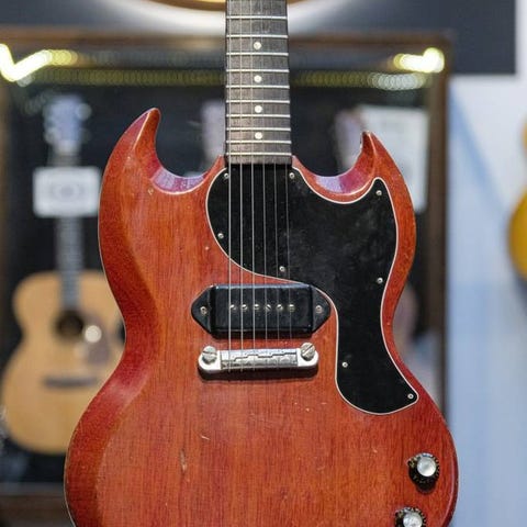 Bra skick, 6/10, tillverkad i USA, levereras med icke-original hardcase. Huvudskadan är lagad, finishen har kraftig naturlig relicing och har bleknat från cherry till brun över hela kroppen. Kraftigt modifierad med extra P90-mik i halspositionen och urfräst baksida för extra rattar. Potentiometrar är bytta, men en originalpot följer med i caset. Original wraparound-stall finns kvar.