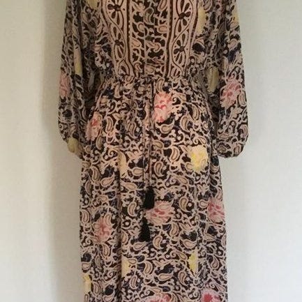 Klänning med lång ärm storlek 36 jättefint skick, Park Lane. Tunn härlig klänning i 100%viskos. Den har dold knäppning fram med en liten silvrig synlig knapp längst upp. Knytband i midjan som du kan knyta antingen fram eller bak. En ficka på var sida i sömmen, se sista bilden. Mått under armarna ca 49 cm, längd ca 100 cm. Klänningen är endast använd ett par gånger. Den är lite ljusare än vad bilderna visar, stämmer bäst överens med de sista bilderna. Hör av dig om du vill ha fler bilder så löser jag det.