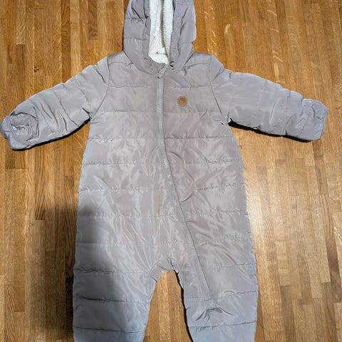 En bra vinteroverall i storlek 80 av märket H&M. Overallens insida är fodrad med fleece för värme och komfort. Den öppnas med dragkedja framtill och är lätt att ta på och av. Det finns två fickor på framsidan som stängs med dragkedja.