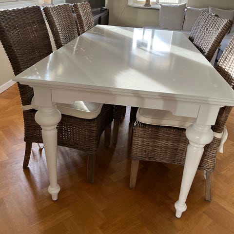 Konstrotting, runt bord med snurrskiva upptill, 6 stolar ink dynor. Annvänt ENDAST inomhus, exakt 1 år gammalt. Som ny.