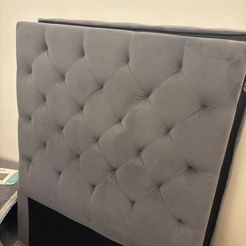 Säng gavel från sweef. I grått sammet med silvriga nitar. 160cm bred.