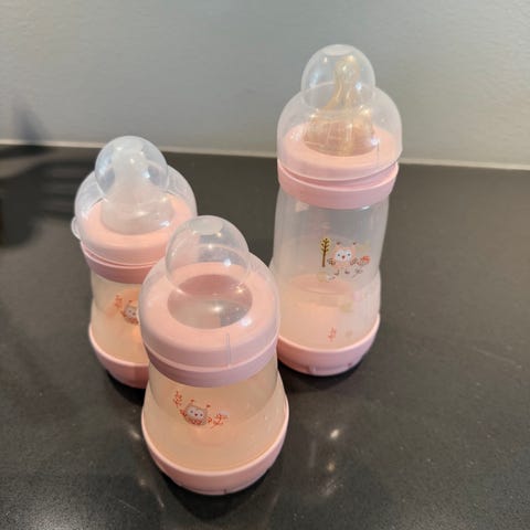 Fyra flaskor till baby. Tre från twistshake i storlek small. En provad men de andra inte använda då vårt barn inte ville dricka från flaska.