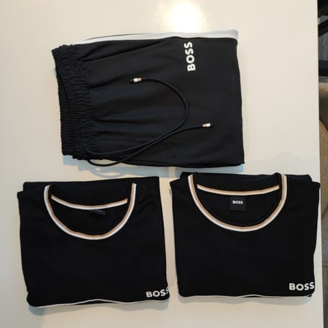 Boss pyjamas med jacka o långbyxor, pyjamaskortbyxor max 3 tvättar på samtliga. Två nya t-shirts med broderade bossmärken stl. XL men är som L. Köpta på Hugo Boss.