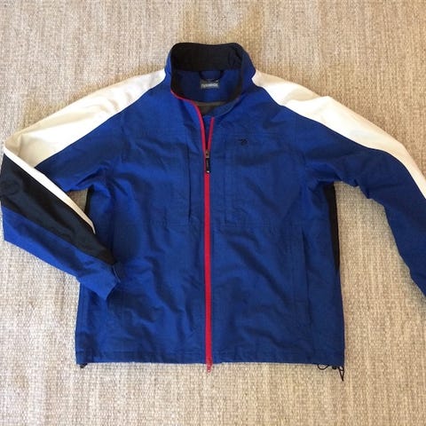 Blå löparjacka från Craft. Vind- och vattenavvisande. 100% polyester. Fickor med dragkedja.