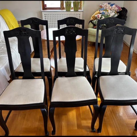 Trevliga matsalsstolar säljes. 8 st varav en av stolarna har ett löst ben. Säkert något den med snickarglädje kan lösa!