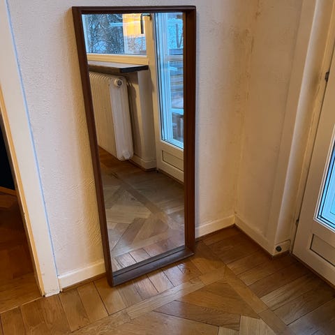 En vacker spegel med en bakgrund av starkt trä och ben, med en tunn metallram. Den är två meter hög och 33 cm bred, i mycket gott skick och väldigt vacker.
