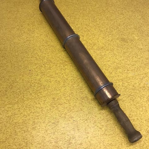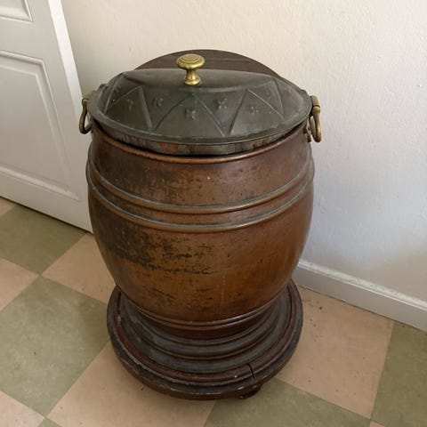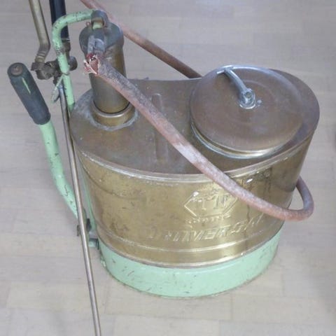 Grönmålad metall, pump och gummislang. Rostig inuti. Mått 45 hög, 30 i diameter.