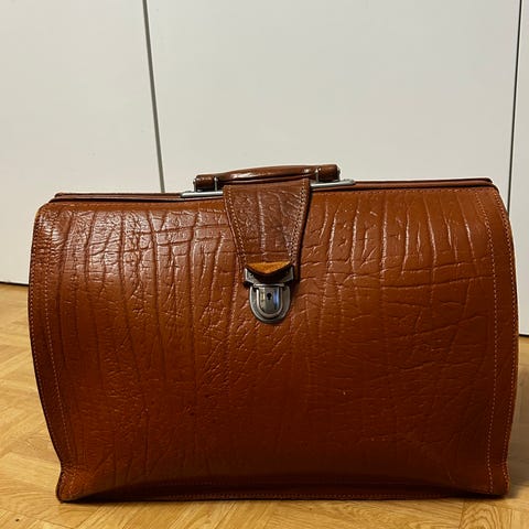 Väska i retrostil. Gammal skolväska i fint skick. Spännena är lite rostiga men det tycker jag själv bara är fint. Väskan är ren och fin inuti. Mäter ca 30 cm x 24 cm