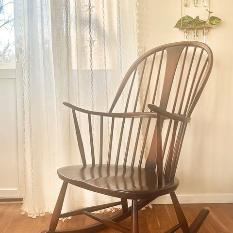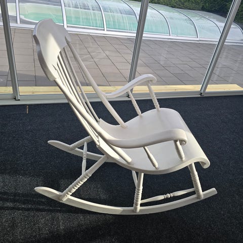 Hej! Min pappa var en konstnär och en snickare. Han skapade och byggde allt, hus mm själv uppe i Dalarna. Han var Timmerman, möbelsnickare och konstnär från Vasa. Jag måste tyvärr sälja denna underbara egen designade gungstol av trä som han snickrat åt sig själv. Så tyvärr av och på grund av platsbrist i hemmet. Den är skön att gunga i och att lägga en skön fårskinns päls i med! Säljs för fast pris, hämtas, hel limmat trä, stora mått, för bagars eller takräcke med bil. Finns att hämta Hägersten Stockholm.
