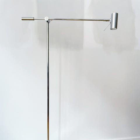Begagnad bordslampa i lackad aluminium och mattsvart färg med brytare på sladd. I fint skick. ”Denna armaturfamilj har sin grund i film och foto industrin. En modern men ändå klassisk tolkning, av gamla strålkastare och fotoblixtar”