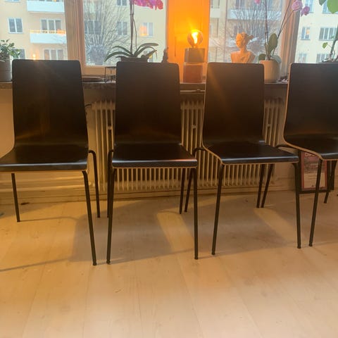 Bekväma stolar från IKEA. Stolarna har sits i grått tyg med bra stoppning, formpressat träryggstöd och stabilt metallunderrede i kryssmodell. Perfekta till matbord, skrivbord eller köksö, både praktiska och stilrena i skandinavisk design.